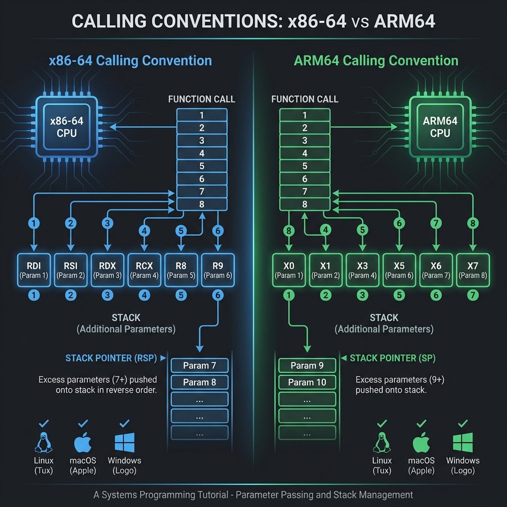 When one function calls another, both must agree on a contract: Where do arguments go? Which registers can I clobber? Who cleans up the stack? This contract is called a calling convention, and it varies dramatically between platforms. Understanding calling conventions is essential for any low-level programmer.